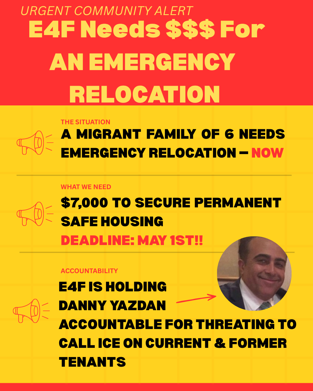 E4F is holding slumlord Danny Yazdan accountable for threatening to call ICE on current and former tenants in order to extort $4,000 to $8,000 per tenant . Danny Yazdan is a criminal and should be in jail!